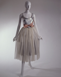Vivienne Westwood, “Statue of Liberty” corset and skirt, silver leather, silver metallic lamé and white silk tulle, Time Machine collection, fall 1988, England, museum purchase