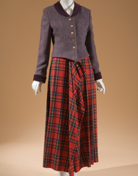 Vivienne Westwood, woman’s jacket and skirt ensemble, purple tweed, red tartan wool, white cotton, Time Machine collection, Fall 1988, England, museum purchase.