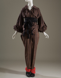 World’s End (Malcolm McLaren and Vivienne Westwood), unisex ensemble, multicolor striped cotton, Pirates collection, Fall 1981, England, gift of Barbara Hodes.