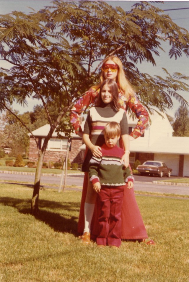 I like the style of this 1973 photo of my children and myself taken in N.J. because it depicts the artistic ununhibited aproach to color of that period. The shirt I’m wearing is in fact a woven cotton bodysuit designed to be worn inside the low-waisted bell bottom pants illustrating the fact that law-waisted pants can be worn without over exposure. Although generally speaking I’m not a flower-prints person, the exceptional color combination of this specific print “took me by a storm” and I just couldn’t leave it in the store. As for the bell-bottom pants I loved the extra width of their hemline which made them appear almost as a maxi-skirt, and their especially long length which balanced their width covering the colorful platform shoes. I believe that the final touch of the large plastic sun glasses in red and yellow adds a glamorous aspect to the look.