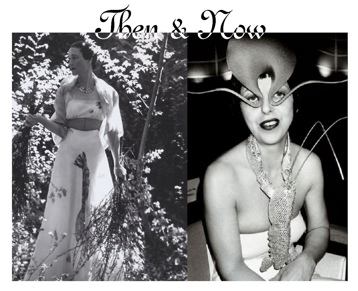 (left) Wallis Simpson, The Duchess of Windsor, in Elsa Schiaparelli’s Lobster Dress, 1937. (right) Isabella Blow in Philip Treacy.