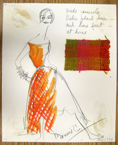 Bonnie Cashin Sketch- Dorothy Liebed Skirt. Full skirt in Liebes plaid linen and suede camisole #1874 "Suede camisole Liebes plaid linen- and bare feet- at home" Signed by Cashin dated "Aug. 1964" US.NNFIT.SC.81.1.1.16.2.29