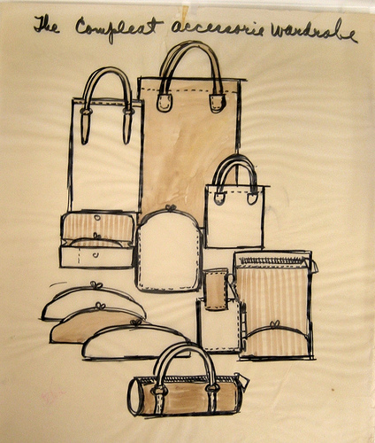 Bonnie Cashin Sketch- "accessories wardrobe". Bonnie Cashin "Cash and Carries" for Coach. Collection of totes, wallets, clutches and key cases, "The Compleat Accessorie Wardrobe". US.NNFIT.SC.81.2.1.2.14