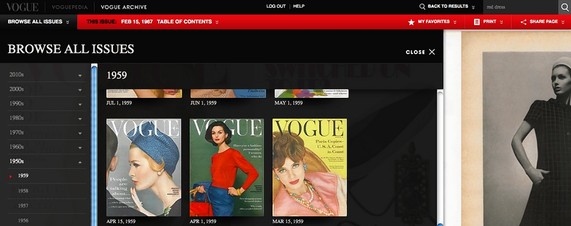 I just found out that Vogue Digital Archive is available for FREE in any NYPL location. This is good news, at least for us New Yorkers, as subscription to the new archives, covering each and every issue from the past 120 years, and including 425,000 images, 300,000 ads, and 100,000 articles, dating back to 1892, comes with a $1575 yearly price tag. ouch!