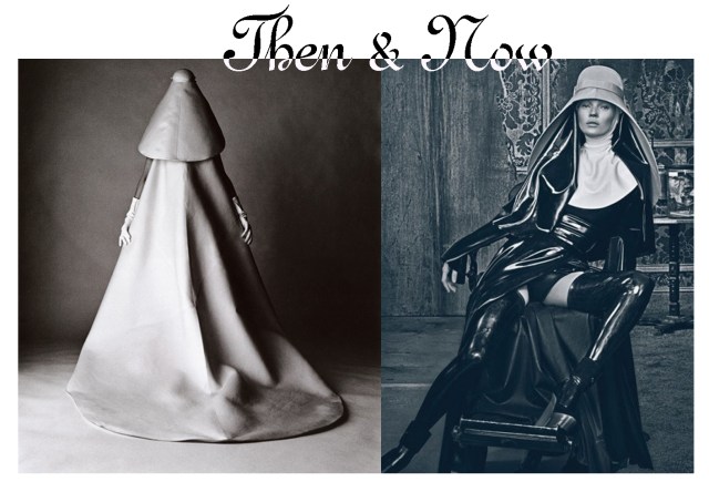 (left) Balenciaga single seam wedding dress, 1967; (right) “Good Kate, Bad Kate,” Kate Moss, photographed by Steven Klein, W Magazine March 2012.