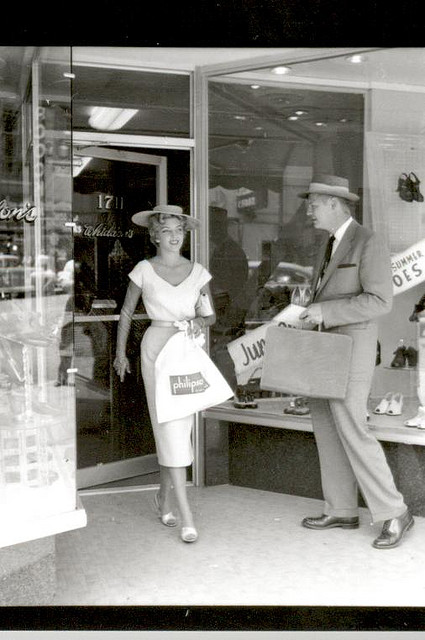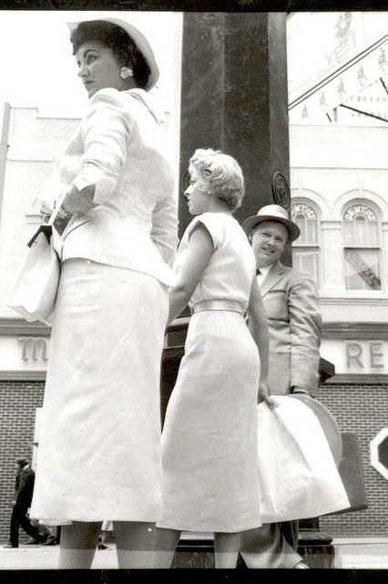 "Here we are in 1950's downtown Dallas with shapely ladies (no size 0 back then!) in their lovely suits, matching purses and shoes strolling confidently down the street and a man in a straw hat giving them an appreciative nod."