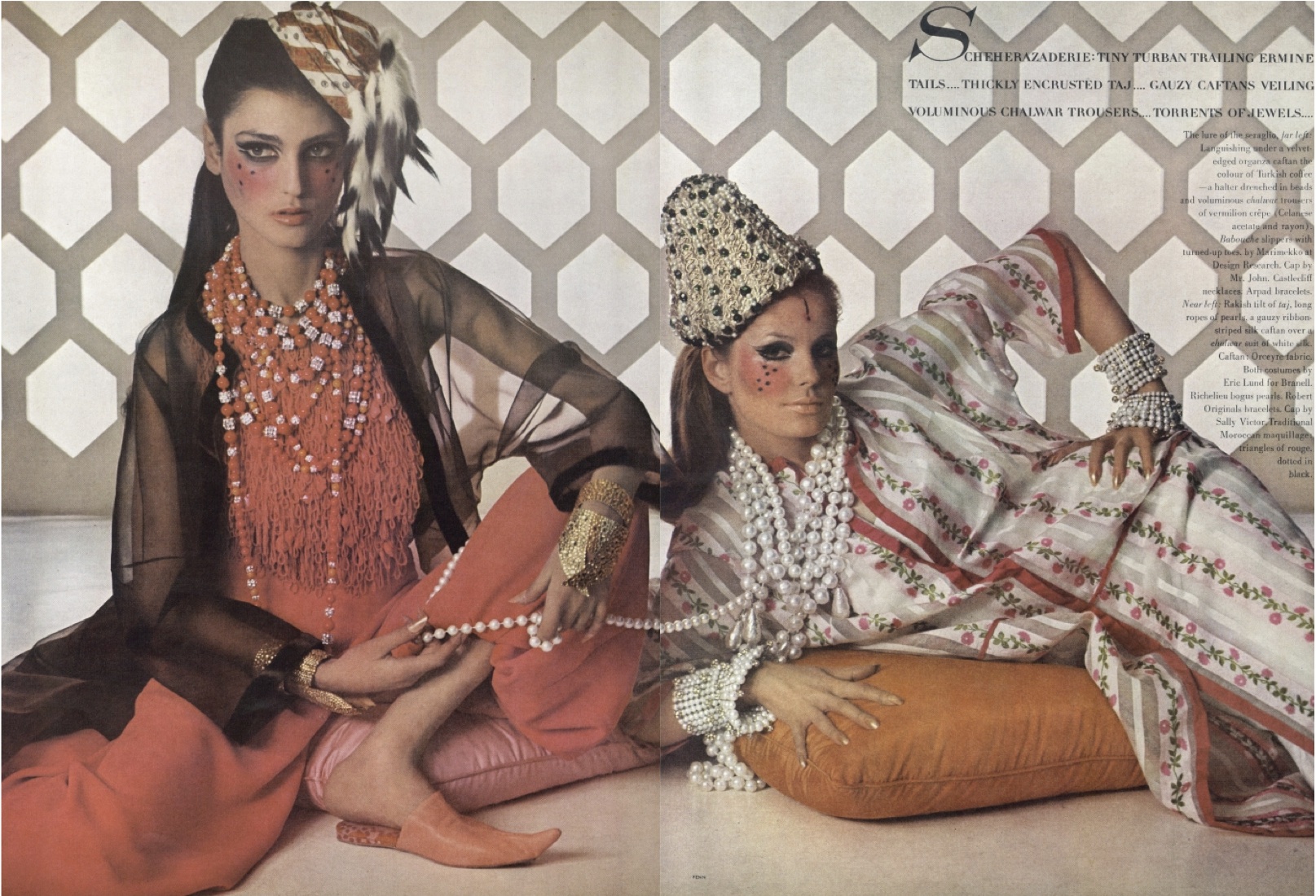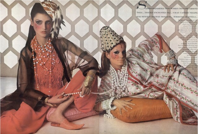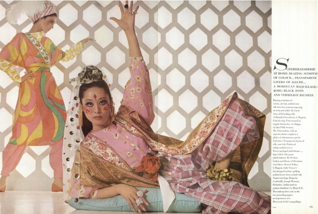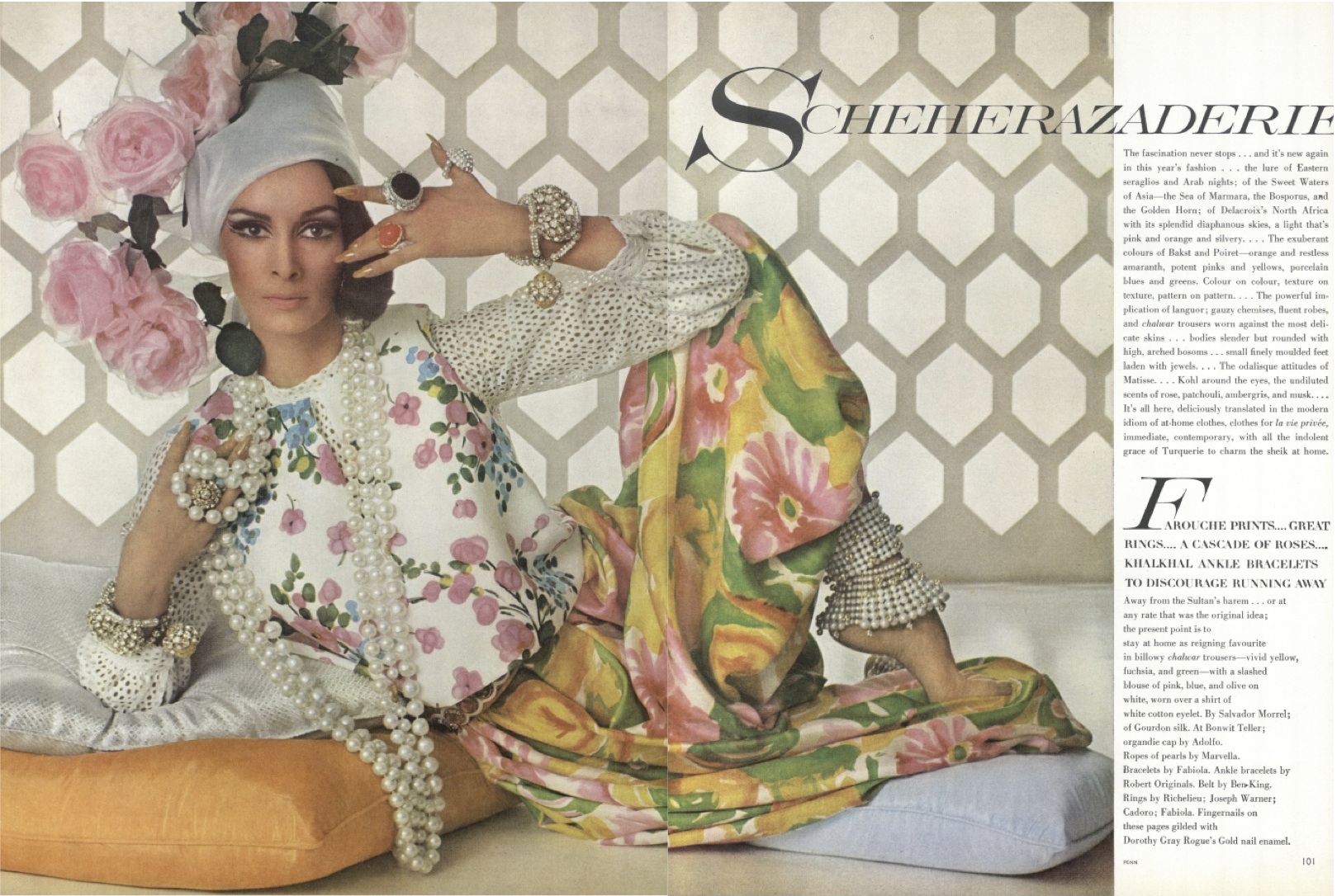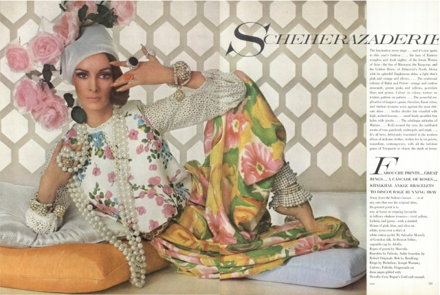 Do you ever wake up and wonder what was happening in fashion on that exact day 30, 40, or 100 years ago? Well I do, which is why I’ve started “On This Fashion Day”! Today’s entry is actually “On This Fashion Month” since it’s from April 15, 1965. The editorial focuses on fashion’s continued fascination with “the lure of Eastern seraglios and Arab nights…of Delacroix’s North Africa with its splendid diaphanous skies…The exuberant colors of Bakst and Poiret…The odalisque attitudes of Matisse…It’s all here, deliciously translated in the modern idiom of at home clothes, clothes for la vie privee, immediate, contemporary, with all the indolent grace of Turquerie to charm the sheik at home.” “Scheherazaderie,” Vogue, April 15, 1965.