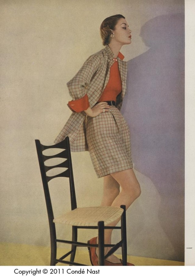 Photo by Horst. Playsuit costume: Tattersall checks in linen, with a blaze of red Hamilton Adams linen, Tebilized for crease resistance. Halter, shorts, about $25; jacket about $25: by Tina Leser. Moccasins $11.50. “Pert” lipstick.