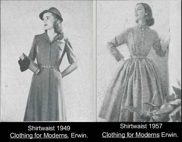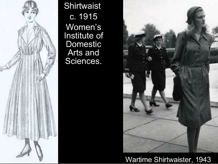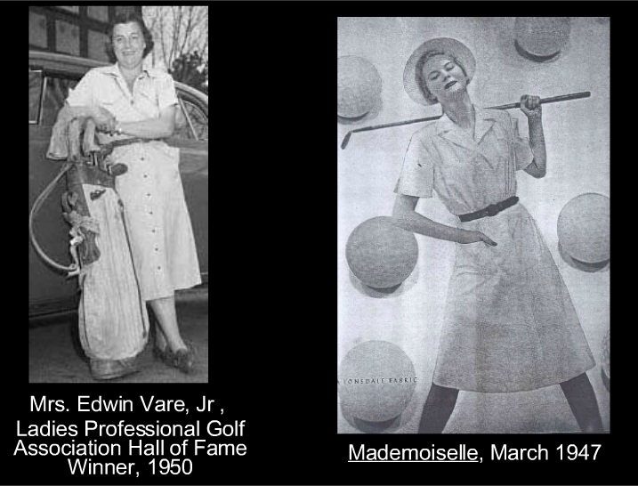 Many of these dresses appeared as golf or other sporting related clothing due to their comfort and practicality. Partington explains that the Utility look remained popular via the shirtwaist, but acknowledges that it changed form.  “The wartime shirtwaister[s] . . . flourished in the form of 1950s dresses which became almost symbolic of the housewife, and were invariably used to dress her in advertisements for household goods”.
