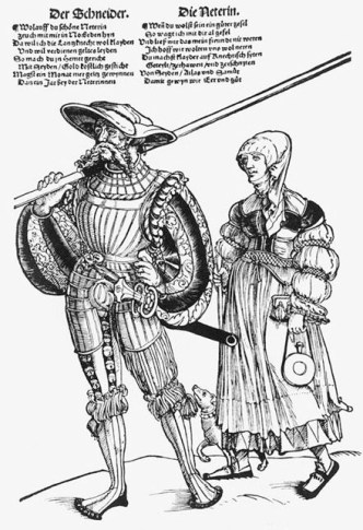 Now you really astonished me, because I had an entirely different interpretation of the picture, based on a book about sexual relationships through history. It is by Reae Tannahill, I have the german translation only. I admit that though I am german I could hardly decipher that renaissanace typo, but in that book there are similar illustrations. I thought rather that “tailor and seamstress” was an ironic title. The man does not wear the clothing of a craftsman, but the very distinctive one of a military officer, complete with a long sword of some kind. I’d say he invites the woman – who might be a seamstress – to become a camp follower. He will slice, slash, tear and cut open other men’s clothing – in battle – an she, besides doing cooking and providing sexual favours – can earn even more money by mending clothes. German lansquenets called their suit “Das Zerhauene”, meaning a suit that has been cut many times and mended with whatever scraps of fabric were at hand, so it took on a motley appearance during the campaign.