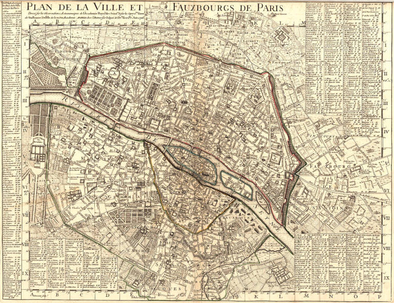 Plan De La Ville Et Fauxbourgs De Paris Dressé sur les Observations AStronomiques de l’Academie Royale des Sciences et sur les Operationes Geom. De Guillaume Del Isle de la meme Academie, 1716.  Copper engraving handcolored with watercolor, 49 x 63 cm. From the University of Washington Libraries. Special Collections Division. Found online.
