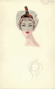 Halston for Bergdorf Goodman. Black, red and green doll hat with front knot and veil, Fall 1959. Pencil and watercolor, 5.5″ x 7″. From The Halston Hats Collection at the FIT Library Department of Special Collections.