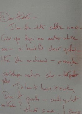 One of his more familiar designs is the pillbox hat he created for Jackie Kennedy Onassis. She became a life-long client, sending him letters, like this request for a dress in a particular hue: