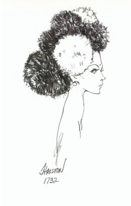 Halston Studio. Large snood shaped hat of oversized fuzzy pompoms in contrasting colors, 1960s. Pencil and watercolor, 5.5″ x 7″. From The Halston Hats Collection at the FIT Library Department of Special Collections.