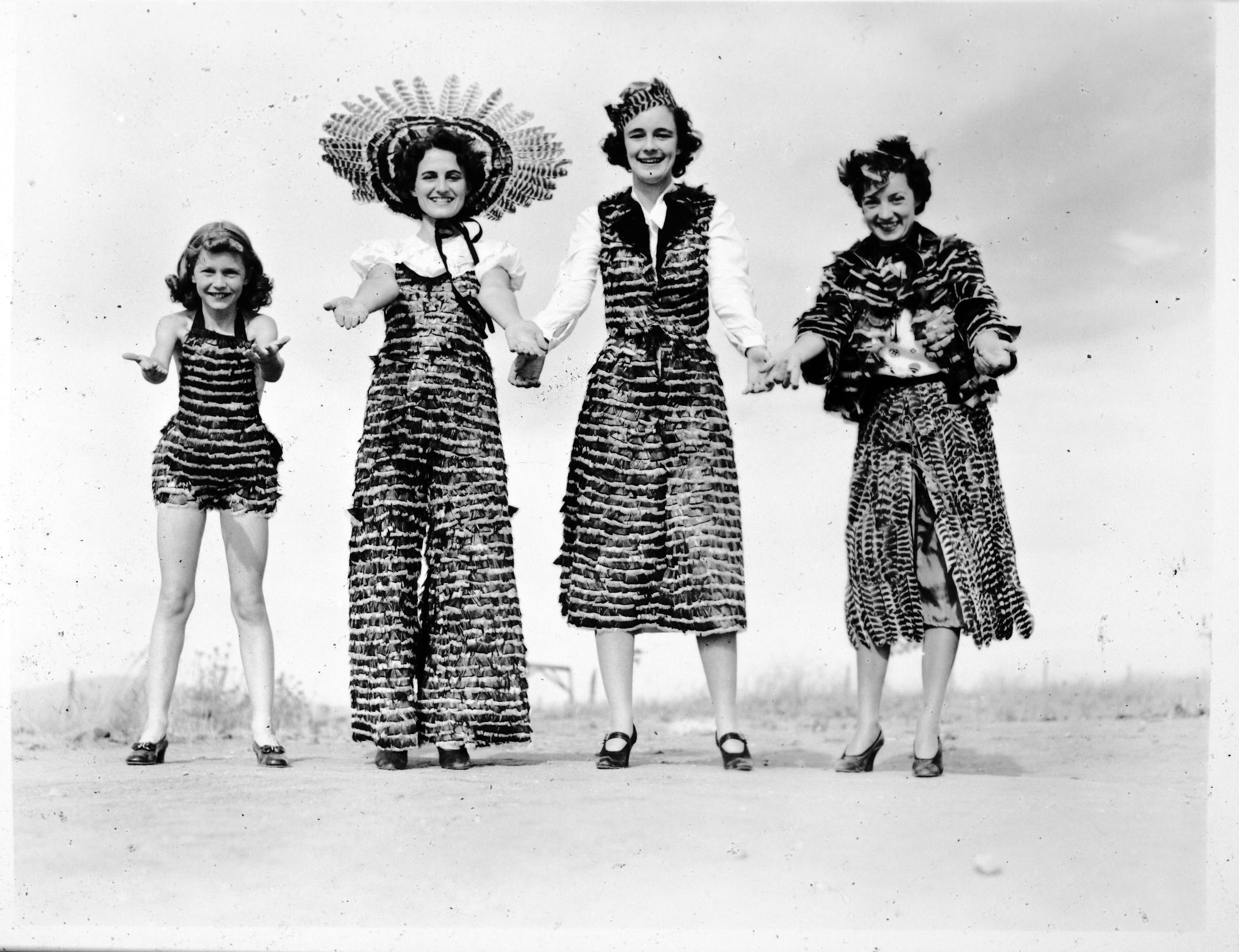 Publicity photo for the Ramona Turkey Day; majorettes and people dressed in clothes made of turkey feathers. No date. Museum of Man, San Diego.