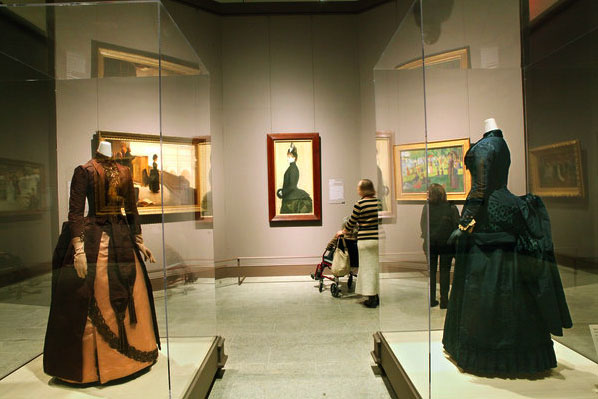 In the paintings displayed at Impressionism, Fashion and Modernity, bold fashions are as prominent as the subject, sometimes overwhelming a portrait with a striped dress or a red bolero. The striking gowns and accessories in these works demand an audience; the color, setting, and subject matter reflect on a new era in fashionable clothing and conduct for the epitome of urbanity – the Parisian.