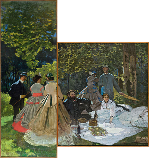 Monet, Claude. Luncheon on the Grass (left panel and center panel), 1865-66. Oil on canvas, 164 5/8 x 59 (left panel) and 97 7/8 x 85 7/8 in. (right panel). From the collection at the Musée d’Orsay. Found online.