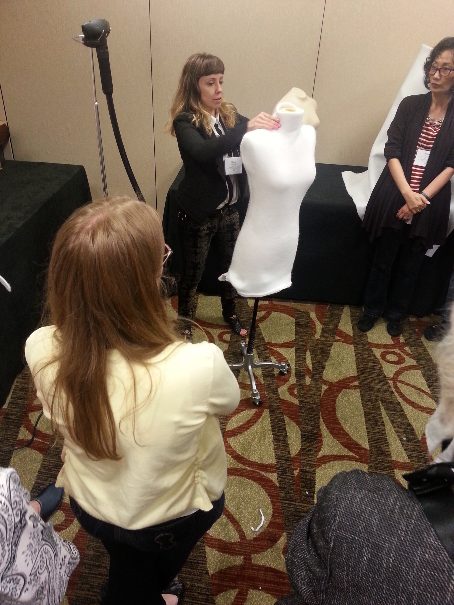 Marla Miles is currently a graduate student at FIT and I was thrilled to see her teaching a workshop on the Secrets of Fosshape. She worked at the Textile Museum in Washington, DC and used Fosshape to bring designs by avant garde Japanese designers to life in their exhibition entitled Contemporary Japanese Fashion: The Mary Baskett Collection. Recently Fosshape was approved as an archival material. When pressure and heat is applied to Fosshape it stiffens and can be used for a variety of purposes for mounting and displaying objects in museums. After a quick powerpoint Marla showed us how to pattern, cut, sew, and steam the fosshape forms. Hands-on activities were the best aspect of the workshop.