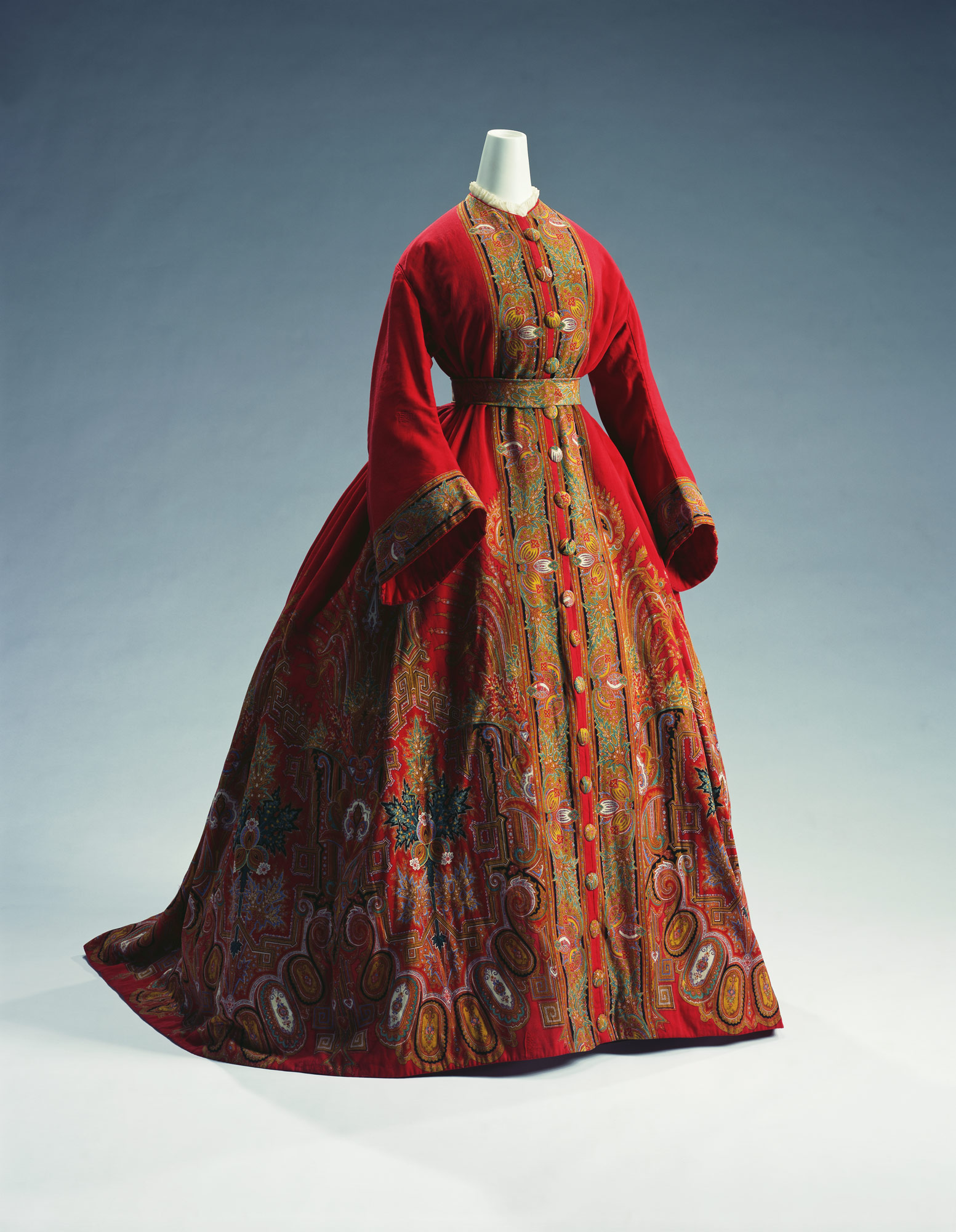 The print on this dressing gown reflects the craze at the time for cashmere shawls. Dressing gown, ca. 1866. Kyoto Costume Institute.