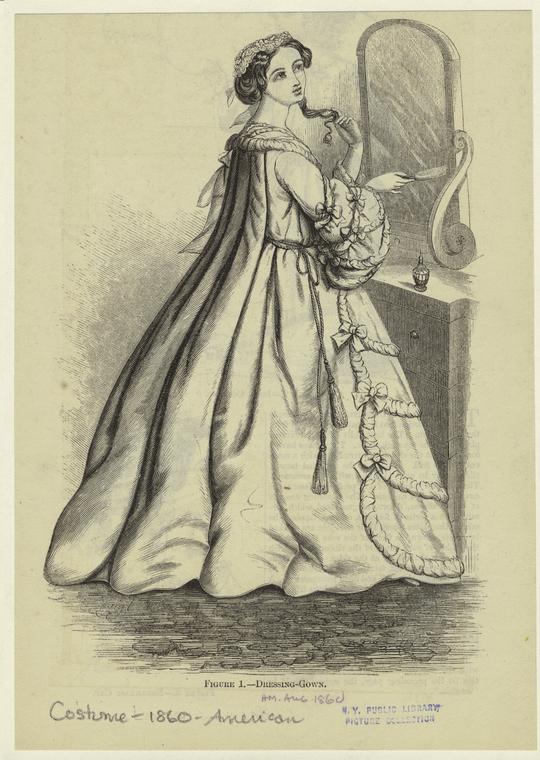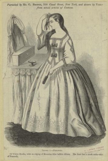 Regardless of the dressing gown’s relation to a scandalous nude portrait, it was very much a part of fashion in the 1860s, even appearing in Harper’s August 1860 and August 1861 issues.