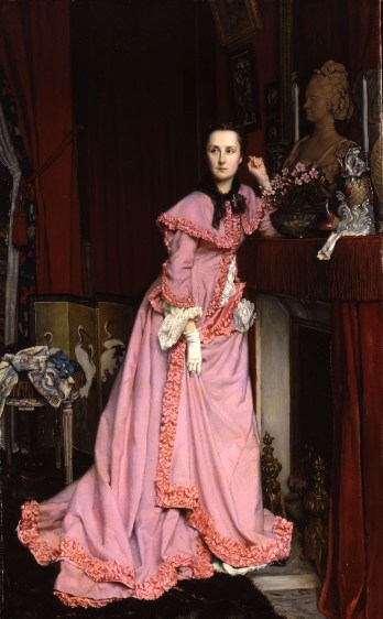 At the Getty Center in Los Angeles hangs this painting by Jacques Tissot. The subject, Thérèse-Stephanie-Sophie Feuillant, the Marquise de Miramon (1836-1912) is painted in a pink velvet ruffled dressing gown. The Getty’s records for this painting are remarkably complete, including two letters from Tissot himself to the Miramon family, asking for permission to display the painting at the Paris Salon of 1867, as well as swatches of the dressing gown’s pink velvet.