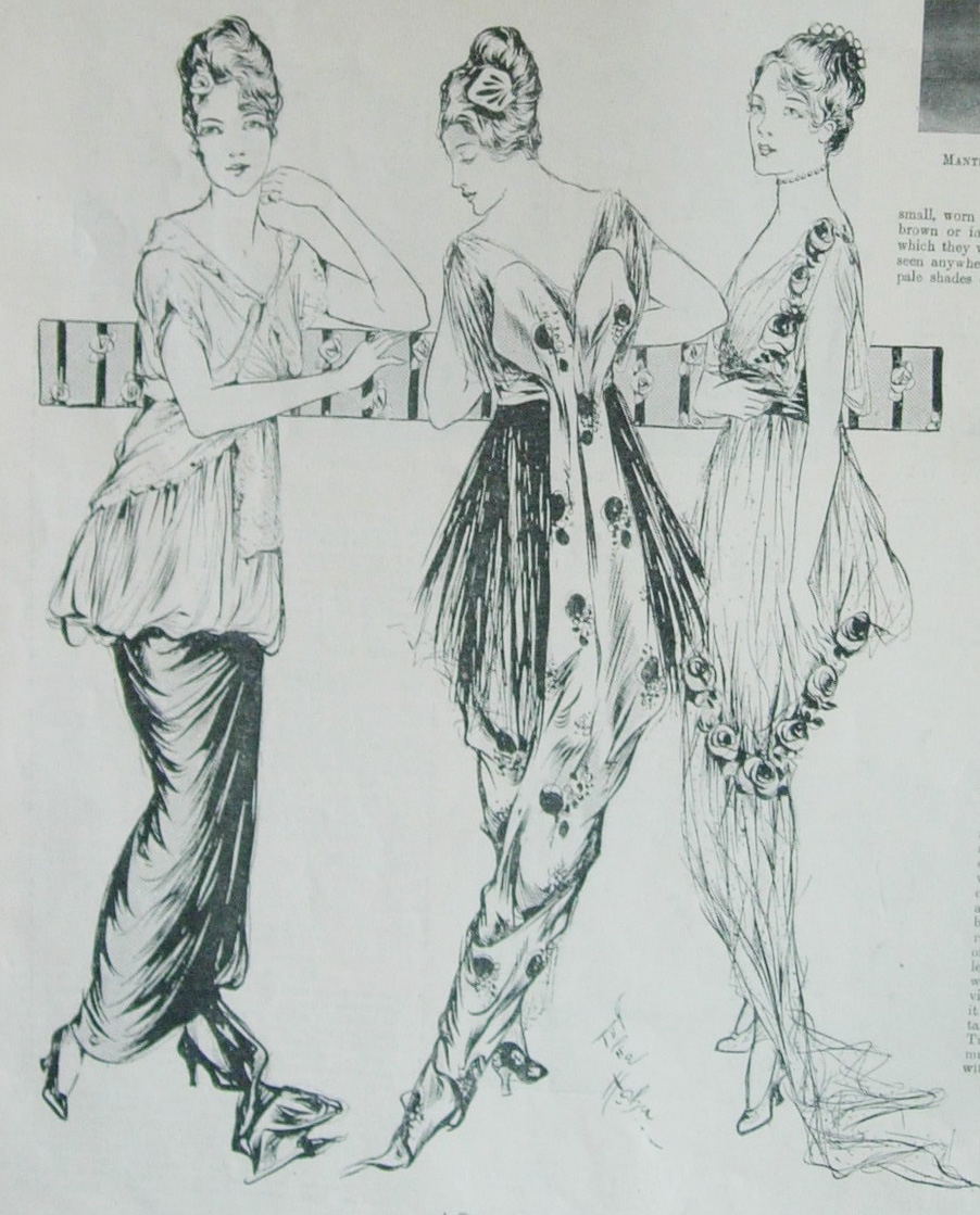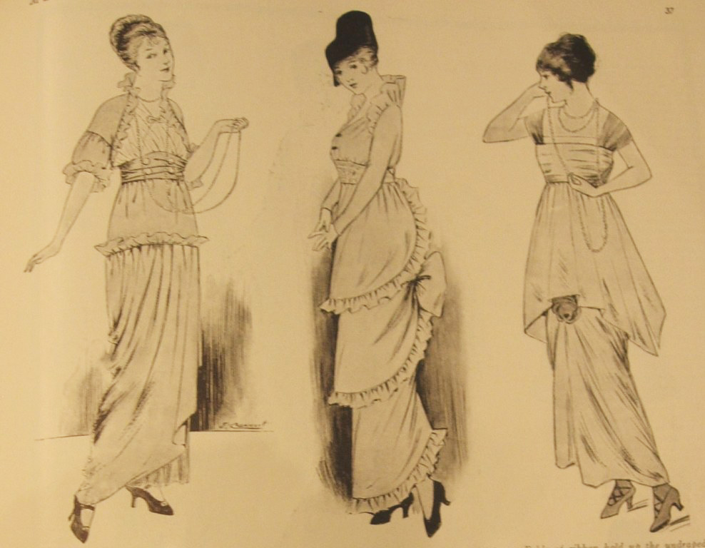 some of the smartest houses are advocating the slender silhouette, there is every reason to expect that limp frocks will be demanded by the clients themselves, and the society, like the little Quaker maiden, will “rip the hoops out of its gown.” The “slender” silhouette does not mean a return to tight skirts—not at all. In fact, skirts will remain ample, but the fulness [sic] will be softly and limply disposed.[5]