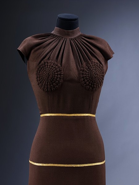 Elsa Schiaparelli, “Falsies” evening dress, brown wool crepe with gold braid, 1936 (London V & A, T.36-1964)
