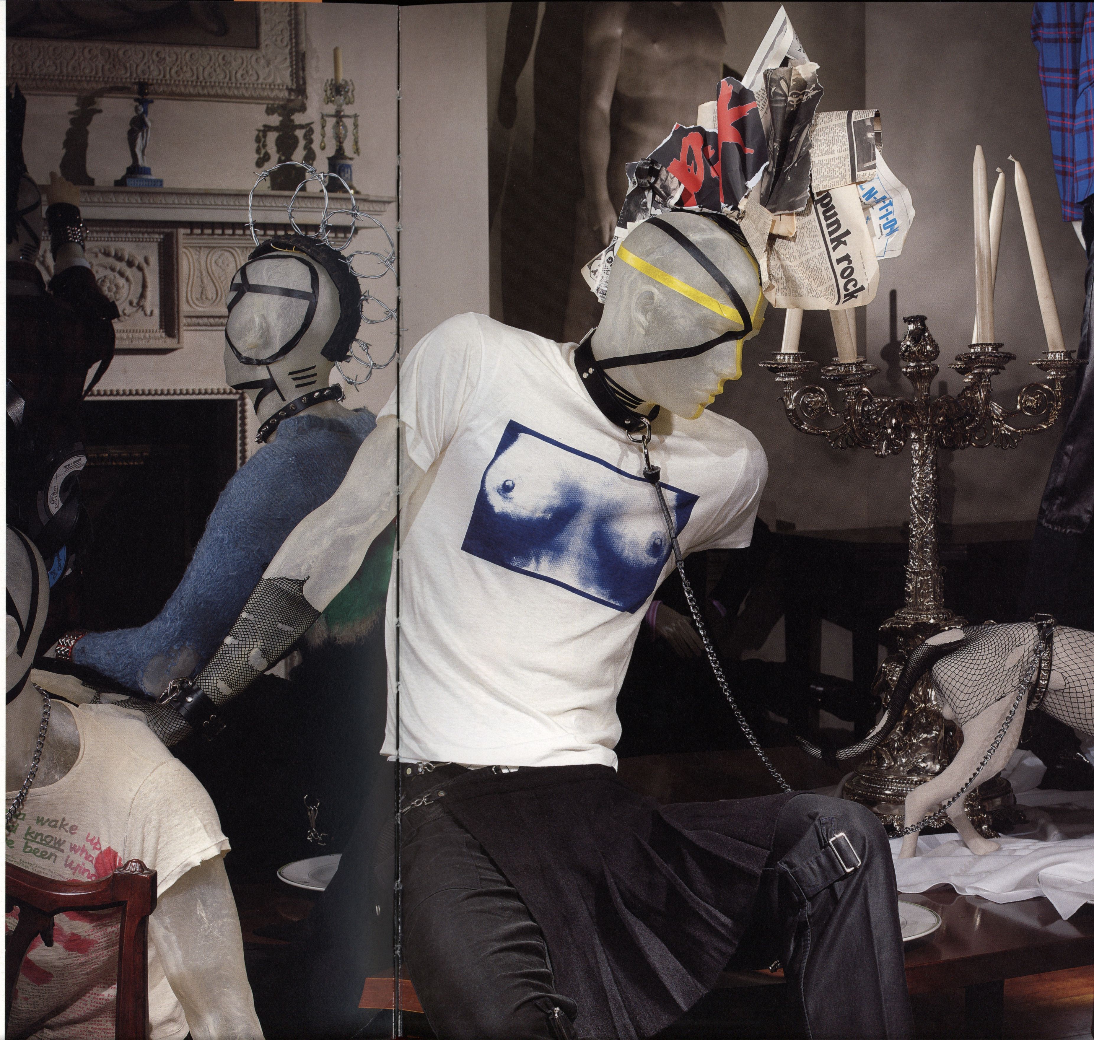 For example, in 1936 she designed a series of dresses on which she appliquéd decorative padding over the breasts. This decorative detail mimicked the padding often sewn into a custom couture gown to enhance the breasts. This was a particularly humorous gesture at a time when larger breasts were coming back into fashion and women were using “falsies.” More than just a clever joke, this gown confronted viewers who looked at the wearer’s chest, with fake breasts as opposed to the real thing. Not only is the viewer made aware of his own sexualized gaze, but also of the ways that fashion literally constructs the body. We can see precisely the same gesture in a t-shirt from Vivienne Westwood and Malcolm McLaren’s punk shop, printed with the photographic image of breasts. The shirt as worn by Adam Ant around 1977, recreated in The costume Institute’s exhibition Anglomania, works in the context of a shocking gesture of gender bending, paired with a combination of a kilt and bondage trousers. Worn by Siouxie Sioux, the shirt calls attention to the sexualized gaze of an audience member looking at her breasts. The shirt confronts the viewer with their fantasy of seeing through the shirt to the breasts beneath, making him self-conscious of his gaze.
