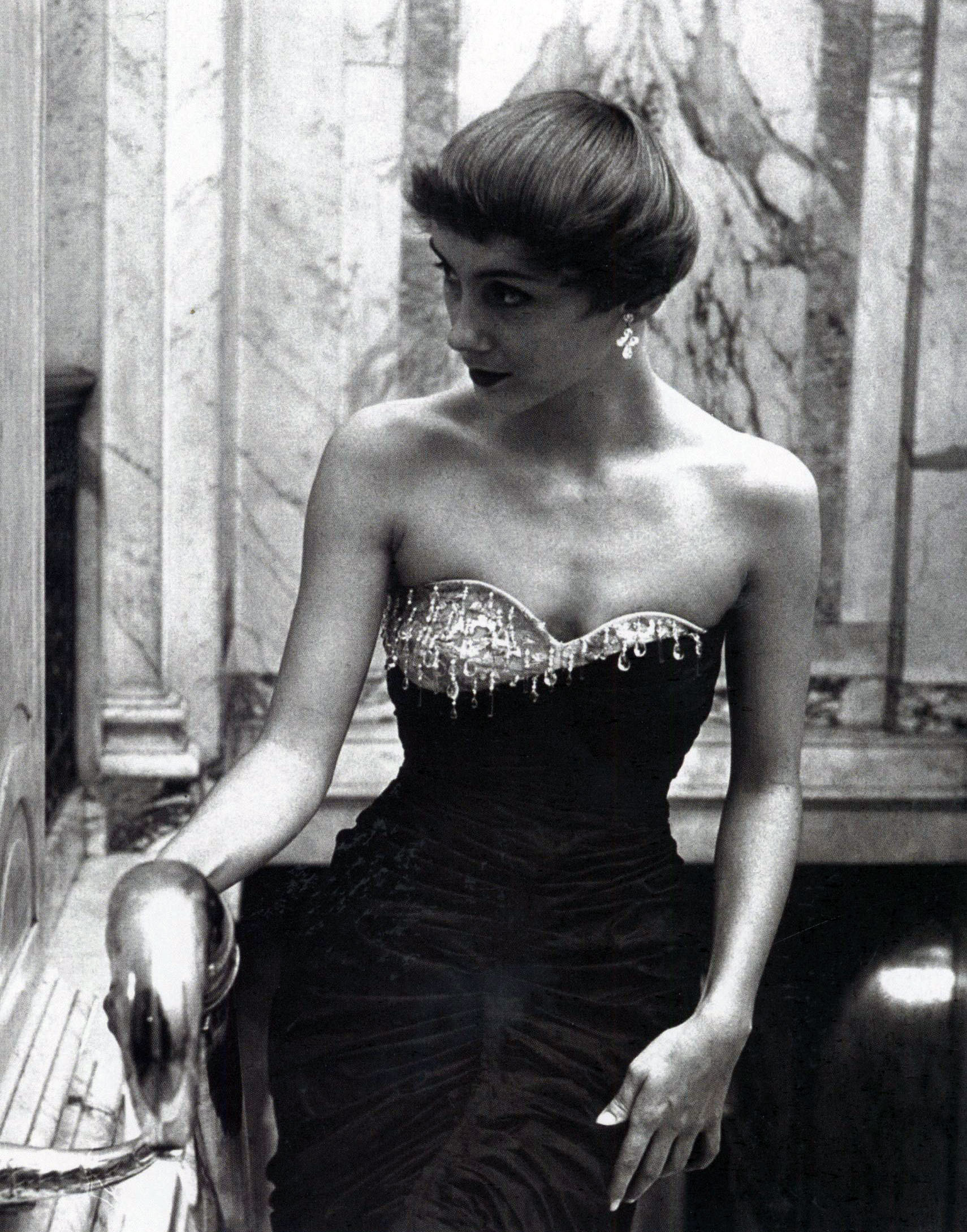 For Winter 1949-1950 she created a series of dresses which tease viewers with revealing décolletage. This slinky evening gown in a dark maroon color called “Forbidden Fruit,” appears to be slipping down to reveal a pale pink brassier embroidered with gold and laden with crystals.