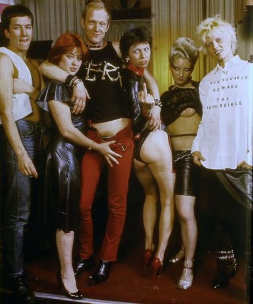 Sex, Malcolm McLaren & Vivienne Westwood’s shop open from 1974-76, London (from left: Steve Jones, unknown, Alan Jones, Chrissie Hynde, Jordan, and Vivienne Westwood)