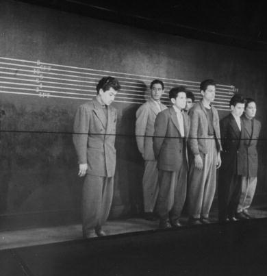 Men in police line up wearing zoot suits. January 01, 1942 photo: Peter Stackpole/Time & Life Pictures/Getty Images