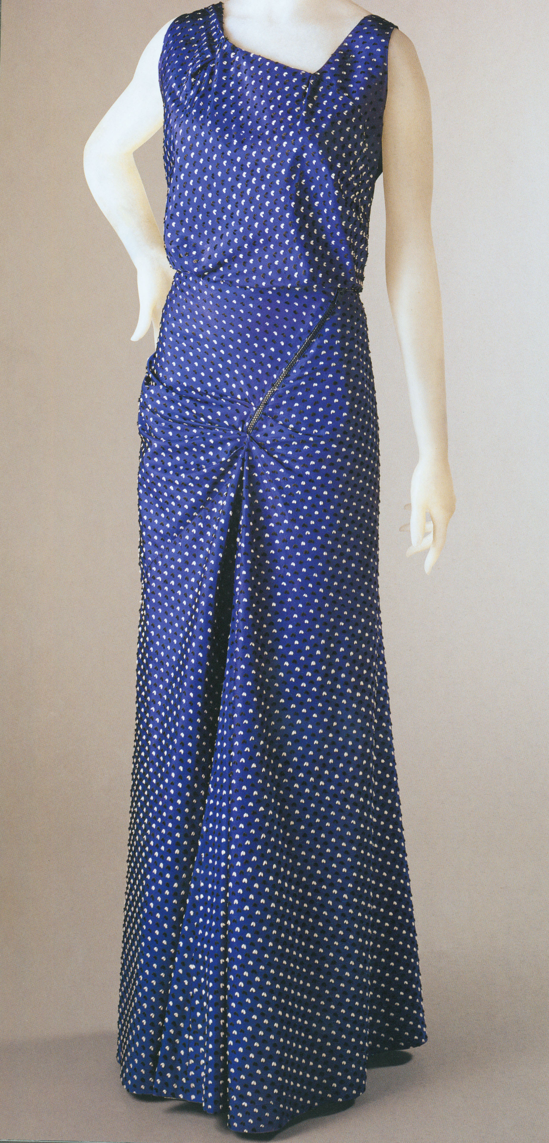 In the mid 1930’s Schiaparelli made zippers popular, not only as fasteners, but as embellishment on her clothes. As with their use on Punk clothing, zippers served as a provocation for Schiaparelli, they encouraged touch and interaction. In her autobiography, Schiaparelli recalled that, “what upset the poor, breathless reporters the most were the zips. Not only did they appear for the first time, but in the most unexpected places, even on evening clothes. The whole [Winter 1935-36] collection was full of them.”[viii]