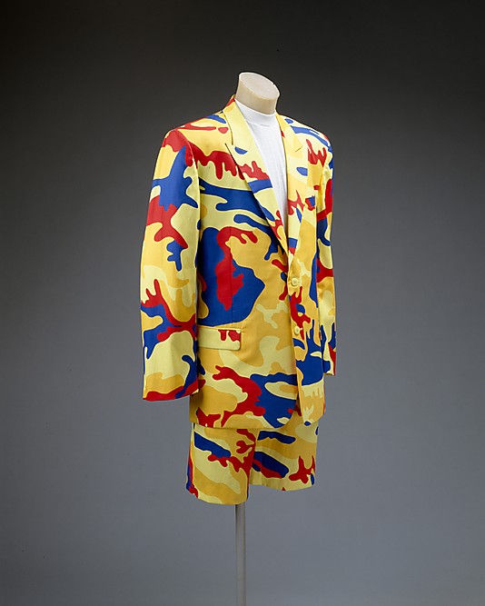Last week I discussed how functional elements from military uniforms lost their original purpose and became merely decorative. A camouflage printed cotton suit, designed by Stephen Sprouse in 1988, is just one example of how far removed elements “borne out of necessity” have became. Sprouse, who used Andy Warhol’s camouflage print, appropriated bright and contrasting colors that do just the opposite of camouflaging- they make the wearer stand out, announcing his individuality. Sprouse does not print a t-shirt or even a sports jacket, but rather a suit- the symbol of the uniformed man. What is even more interesting in Sprouse’s design is the shape of the suit itself; although paired with shorts, the jacket is surprisingly quite conventional.