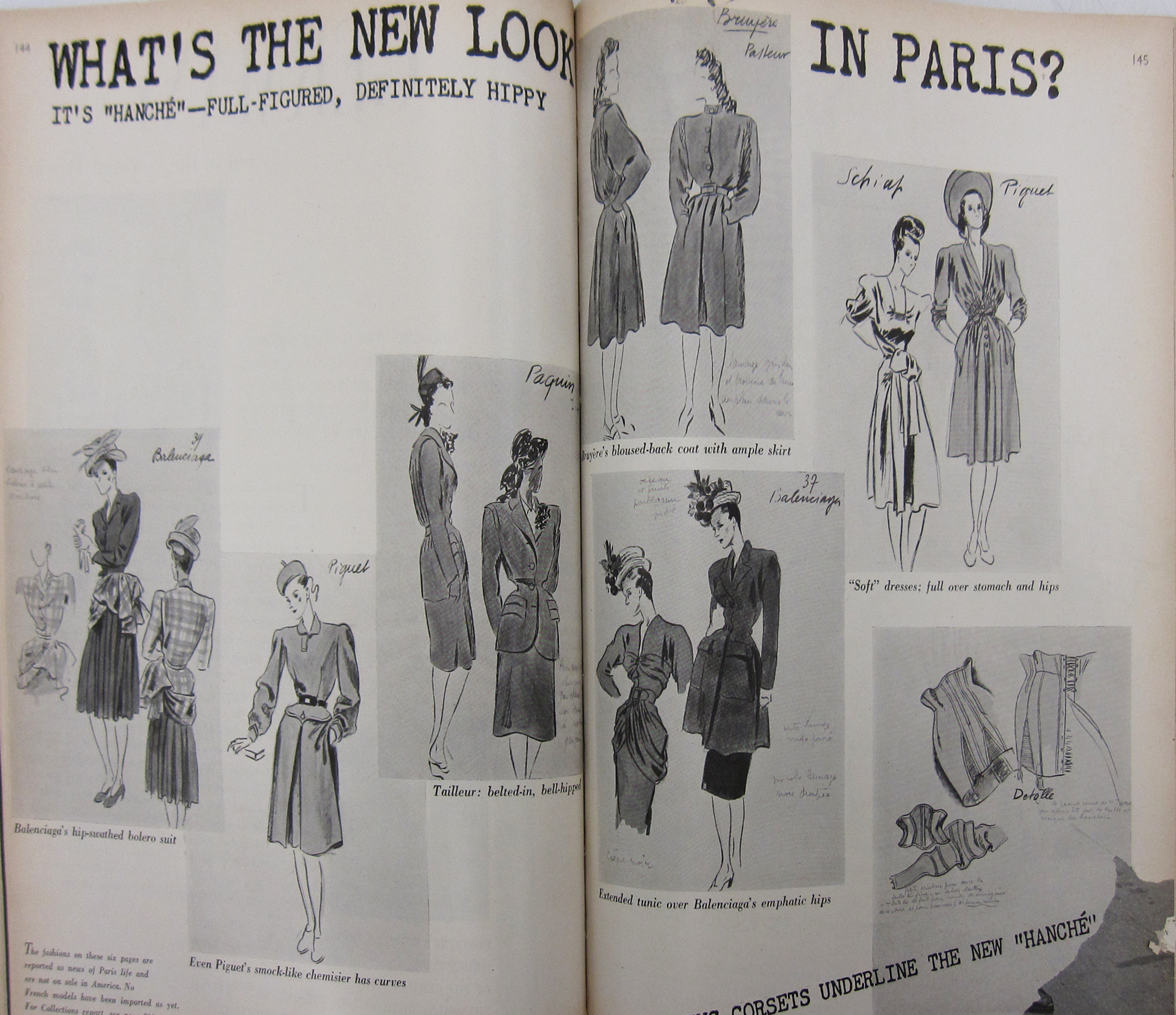 The following page introduces the newest fashion from Paris. Scanned from American Vogue, June 1945, p.145-6.