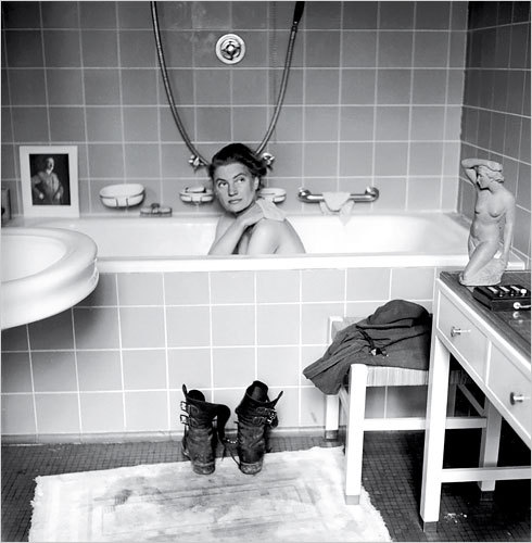 It is, of course, interesting to compare how fashion magazines in war time confronted the problem of reporting on current events, yet continuing to promote fashion. The photographer Lee Miller, American Vogue‘s war correspondent, who accompanied the Allied Forces was one of the firsts to send out pictures of the concentration camps Buchenwald and Dachau, as well as pictures from occupied Germany. One of the most famous pictures of that period was of her in Hitler’s bathtub in his Munich residence, taken by Life Magazine photographer David E. Scherman.