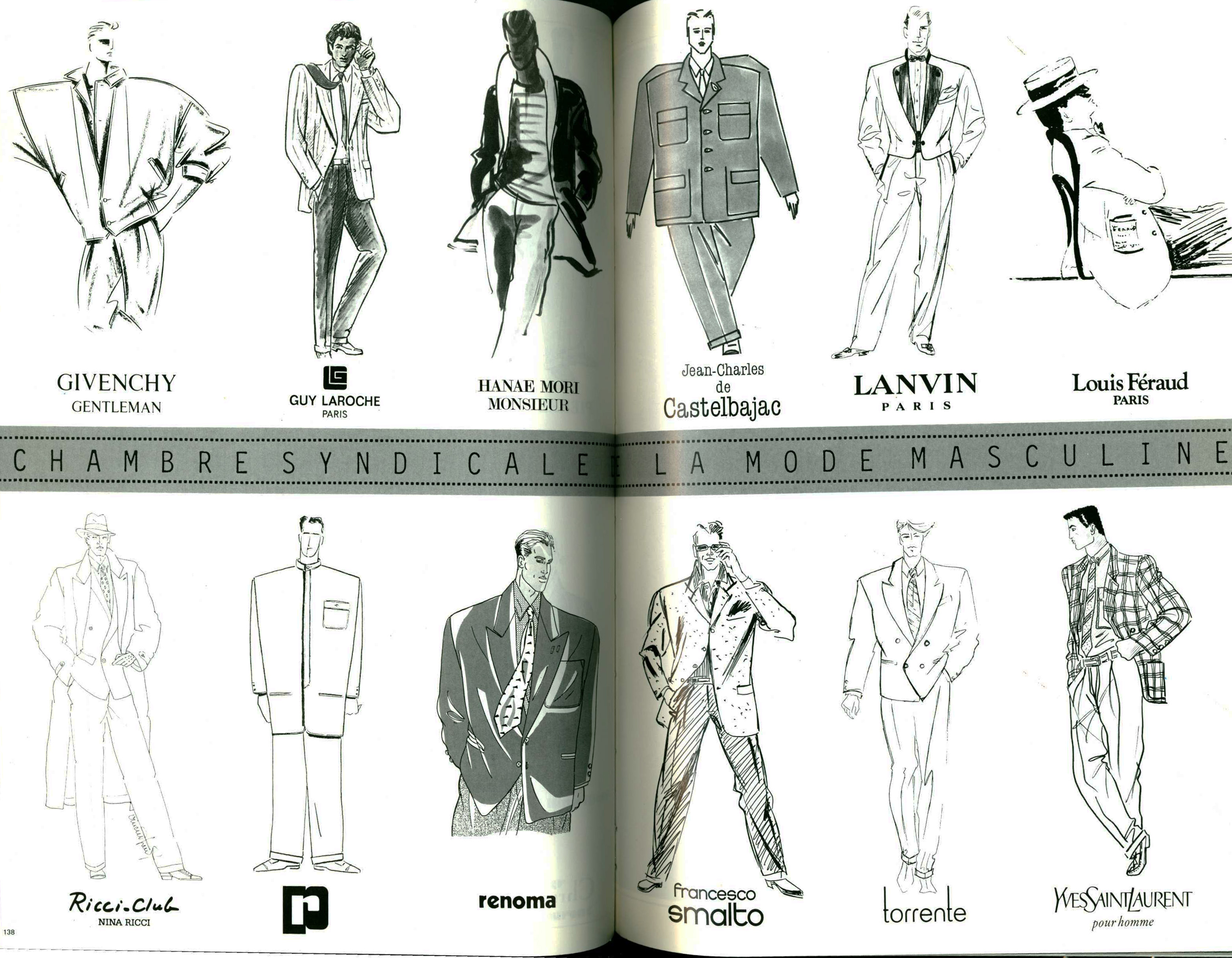 Broad shoulders and soft tailored suits were fashionable during the 1980s and were offered by most major designers for both formal and informal events. Scanned from Vogue Homme September 1986.