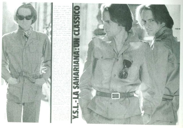 Last week I discussed Saint Laurent’s women’s collections of the early 1970s which already feature the1980s characteristic- broad shoulders. However, Saint Laurent’smen’s wear silhouettes of the same period are still slim and narrow at the shoulders. Yet, it is interesting to note a clear military influence in both his men’s and women’s lines. Two examples from L’Uomo Vogue illustrate how Saint Laurent appropriated elements from Colonial khaki uniforms in his men’s sportswear; these examples directly correspond with Saint Laurent’s Safari suits for women, and demonstrates how the designer projected one vision for both men and women- another new and innovative concept at that time.