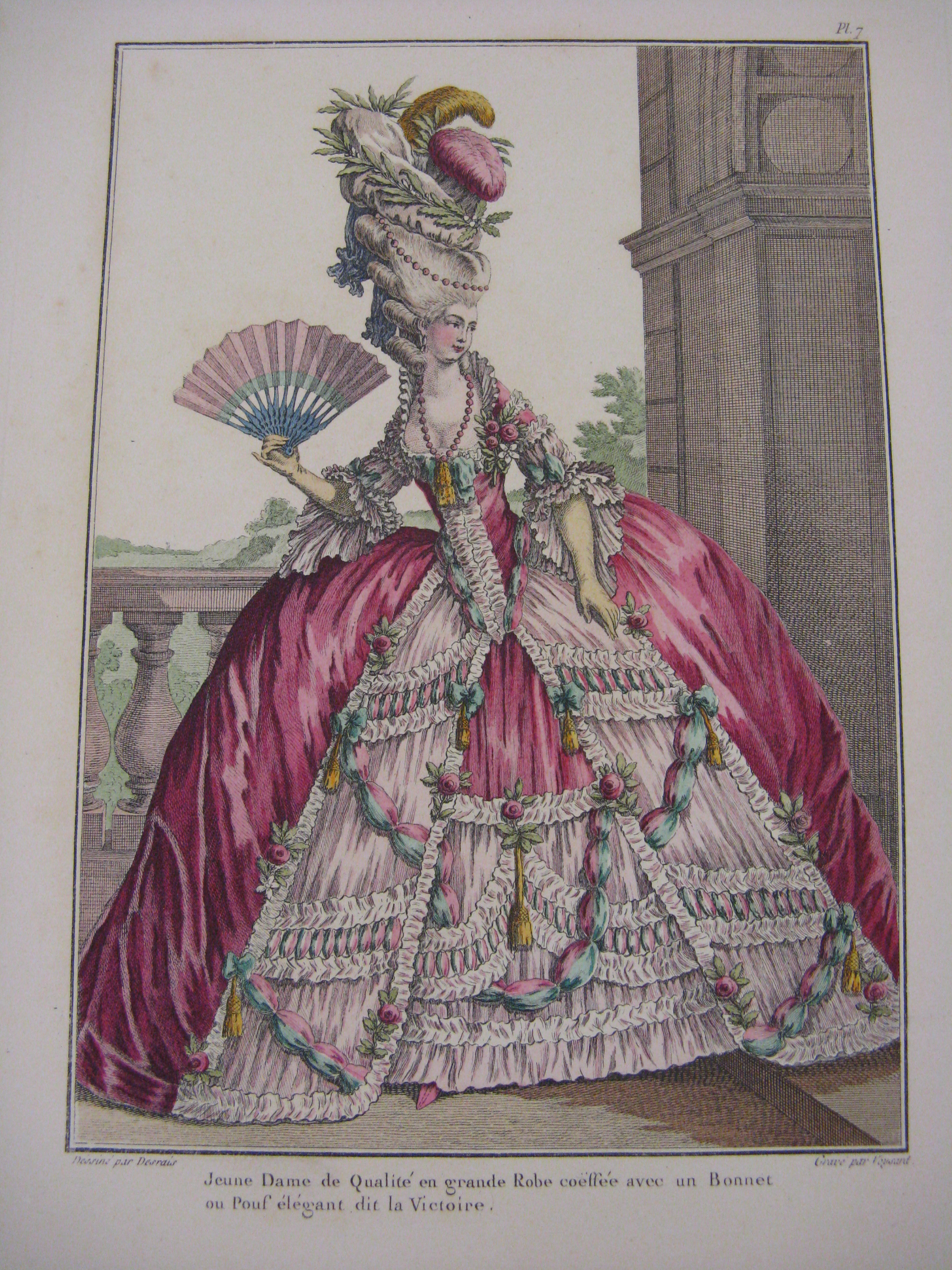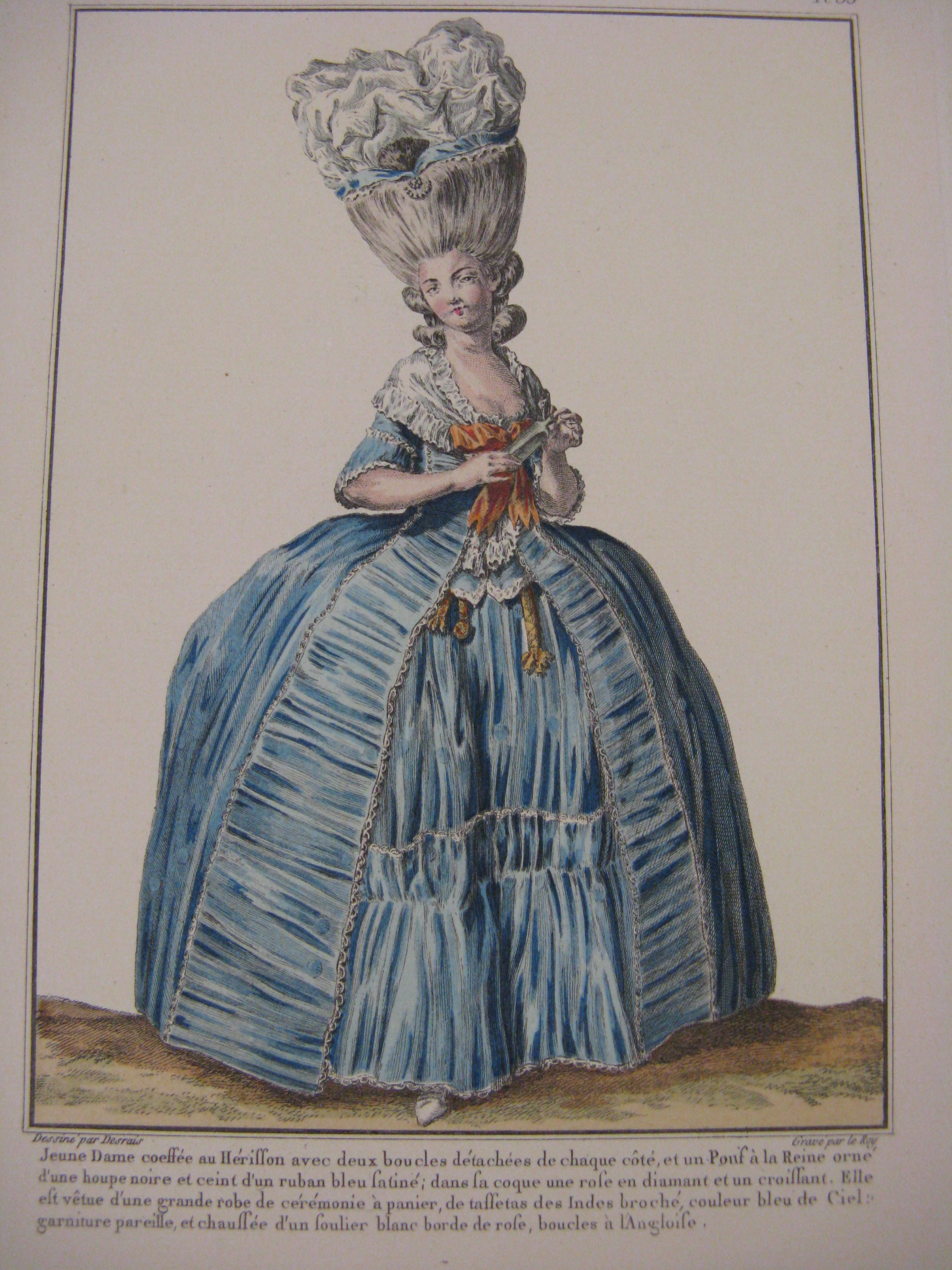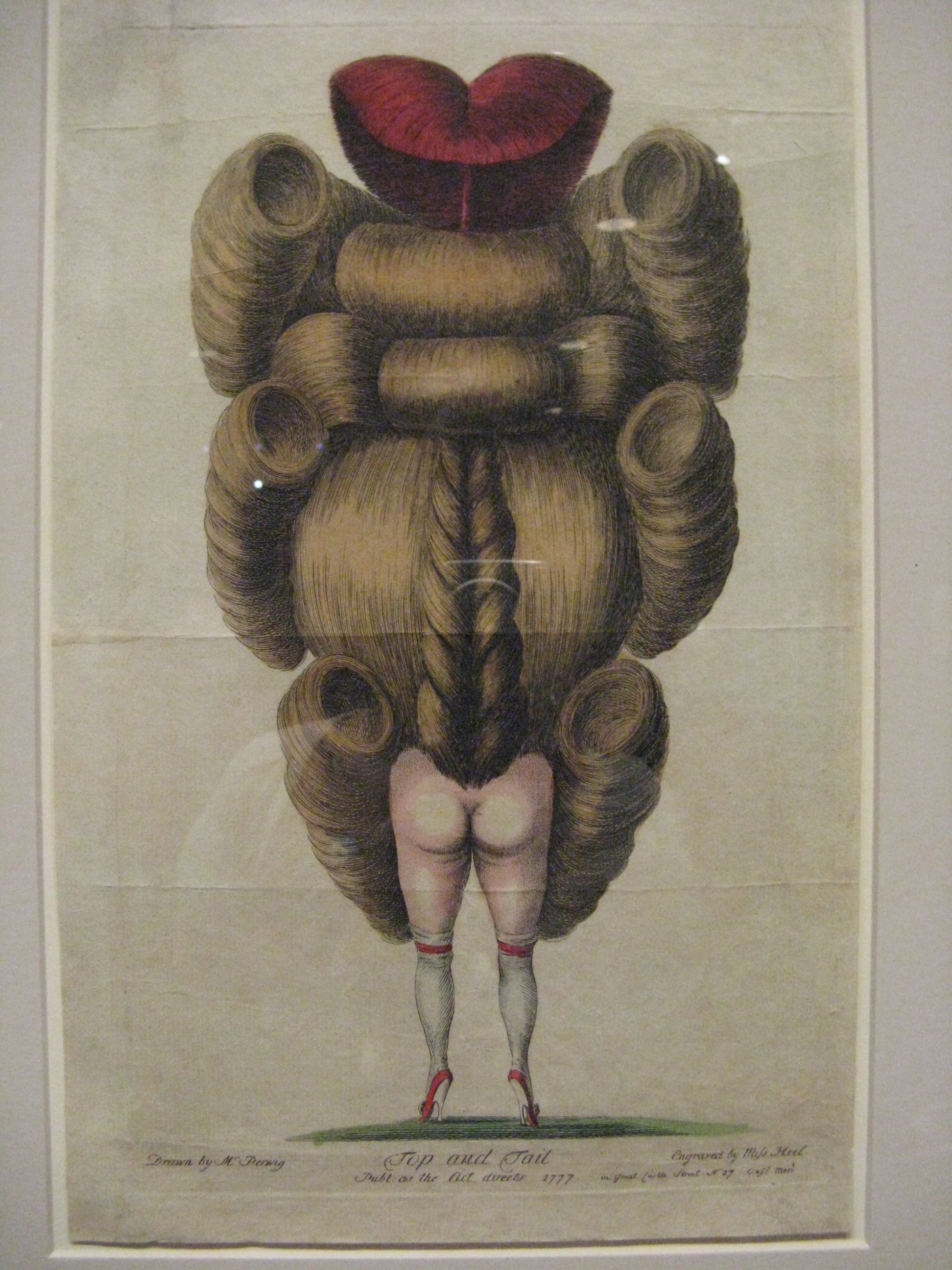 Fashion is always silly, for, before it can spread far, it must be calculated for silly people; as examples of sense, wit, or ingenuity could be imitated only by a fewThe print above was shown at The Metropolitan Museum of Art’s exhibition of caricatures. It shows only the back view of an elaborately done pouf and the derriere and legs of a woman with stockings, garters, and high heels. This print is a satirical image reminiscent of actual fashion plates such as these seen above from the Galerie des Modes. The caption written by the museum says that this print suggests that the followers of this fashion were brainless.