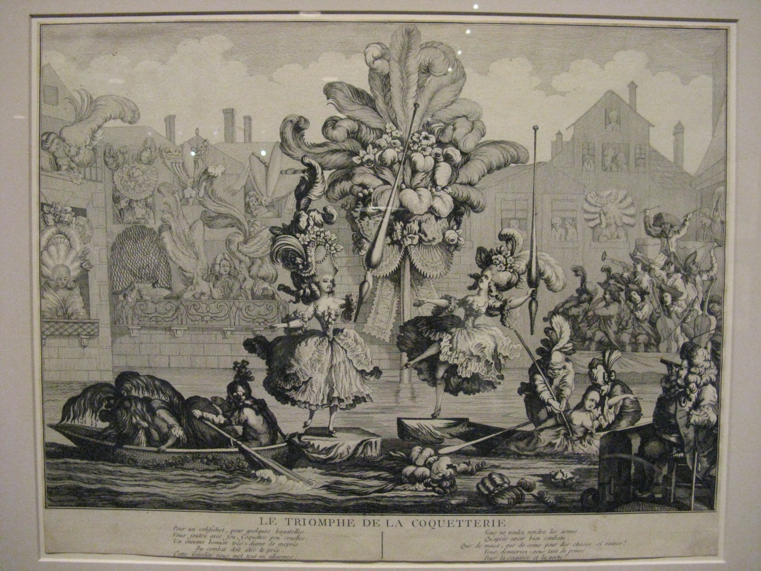 The French print Le Triomphe de la Coquetterie (below0), also from the same exhibition, shows two women with incredibly elaborate poufs piled enormously high with larger than life feathers, many flowers and pearls. These women are standing on two platforms in the middle of a pool jousting to win an impossibly large and elaborate head-dress in the middle of them. Two other women have already been defeated with one in a rowboat, looking like she has just been pulled from the water with her pouf ruined; and another being pulled from the water bald-headed with her head-dress floating in pieces in the water. The women spectators have unrealistically high and elaborate poufs themselves of all shapes and sizes larger than their person. The inscription, written in French, on the bottom chides the women (the coquettes) for their frivolity in fighting over an item of fashion, and asks them if they would do the same for wisdom and virtue.