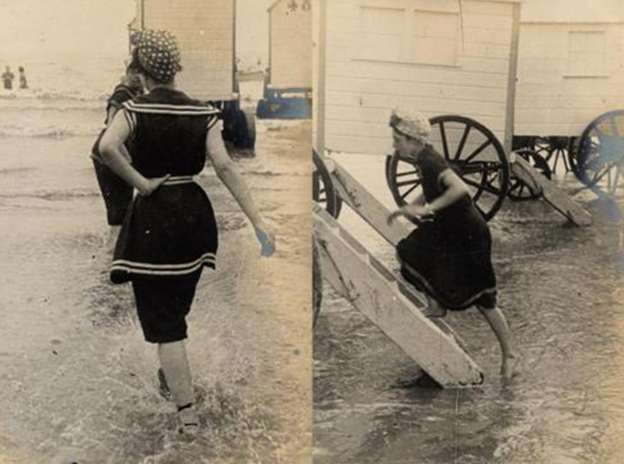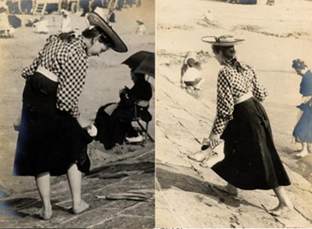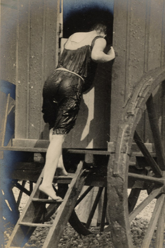 Paul Martin was born on April 16, 1864 in Herbeuville, France, but made his life in London, England after his parents moved the family there to escape the hardships of the Franco-Prussian War. He worked as a woodcut illustrator, taking up photography as a hobby to aid in his creation of engravings.[12] He began photographing people secretly in 1892, when he purchased a camera known as Fallowfield’s Facile Hand Camera. Advertisements of the camera explained how it could be disguised in a wrapping of brown paper, making it look like a parcel, possibly containing a book or two, wrapped by a shopkeeper.[13] Without the hindrance of a tripod, and with the camera’s ability to take twelve shots before it needed to be refilled with plates, Martin was able to take his street photographs with extreme discretion. The neighborhood he lived in was poor and run down, so most of his photographs are of working class people. However, he did take his Facile camera on holiday trips to Boulogne, Paris and Yarmouth, where he captured fashionable fellow vacationers on film. The result is an incredibly relaxed, natural look that shows us with the least amount of artifice how clothes were being worn during the late nineteenth and early twentieth century. His photographs of women on the beach or the boardwalk, are particularly telling of casual attire and sportswear.